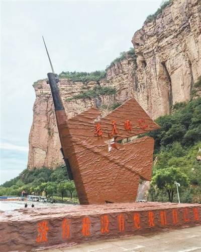 r尽管路上还大雨倾盆,我们到达景区时,雨基本停了。首先映入眼帘的是群峰之间的大型雕塑,主体状如一面猎猎飘扬的红旗。雕塑右部,状如旗杆的一把钢枪直指苍穹,上面用繁体字从上至下镌刻着“八一式.1941.黄崖洞兵工厂制造”等字样;正面台基上从左到右镌刻“共和国军工从这里走来”,背面台基上从左到右镌刻“没有枪没有炮我们自己造”。题字,旗帜、钢枪造型以及有深刻寓意的汉字标语,共同构成了独具特色的文化地标。